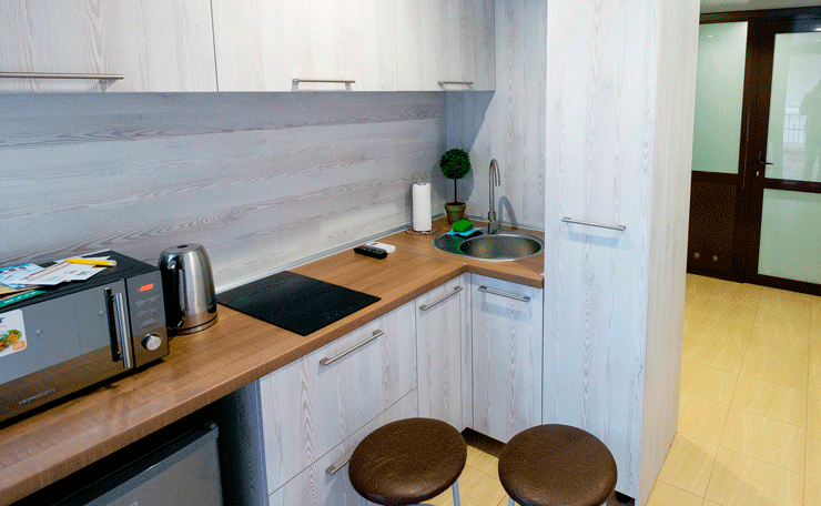 Studio Room — это номер модульного типа, современный, комфортабельный вариант размещения, площадь которого 12 кв. м. Для удобства гостей там есть встроенная мини-кухня со всей необходимой утварью, посудой и бытовой техникой (электрочайник, СВЧ-печь, холодильник, варочная панель), комфортная откидная кровать (120*190см), телевизор, а также совмещенный санузел с душевой кабиной. Теплые полы, кондиционер и обогреватель позволяют круглогодичное проживание в такого рода помещении. Номер расположен рядом с гостиницей и предусматривает как 1-местное, так и 2-местное размещение.